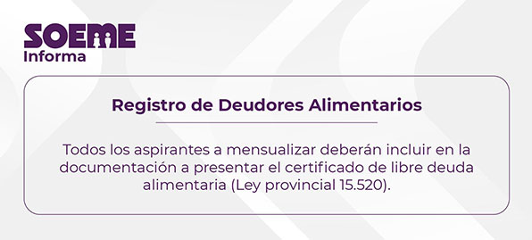 SOEME informa que los auxiliares o aspirantes a mensualizar tienen que presentar certificado de libre deuda alimentaria.