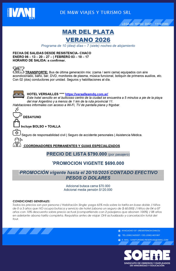 Para más información comunícate por mail a turismo@soeme.com escribinos un WhatsApp al +54 9 1161337141